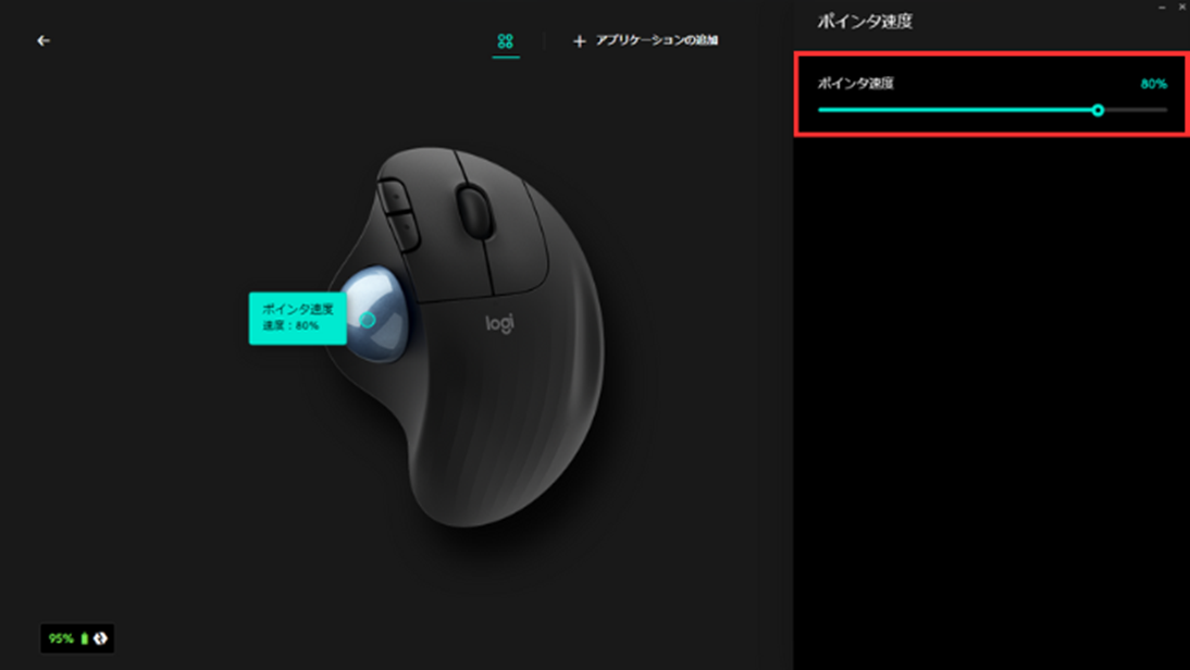 「速度」の項目にあるスライダーを左右に動かすことで、ポインターの移動速度を調整できます。