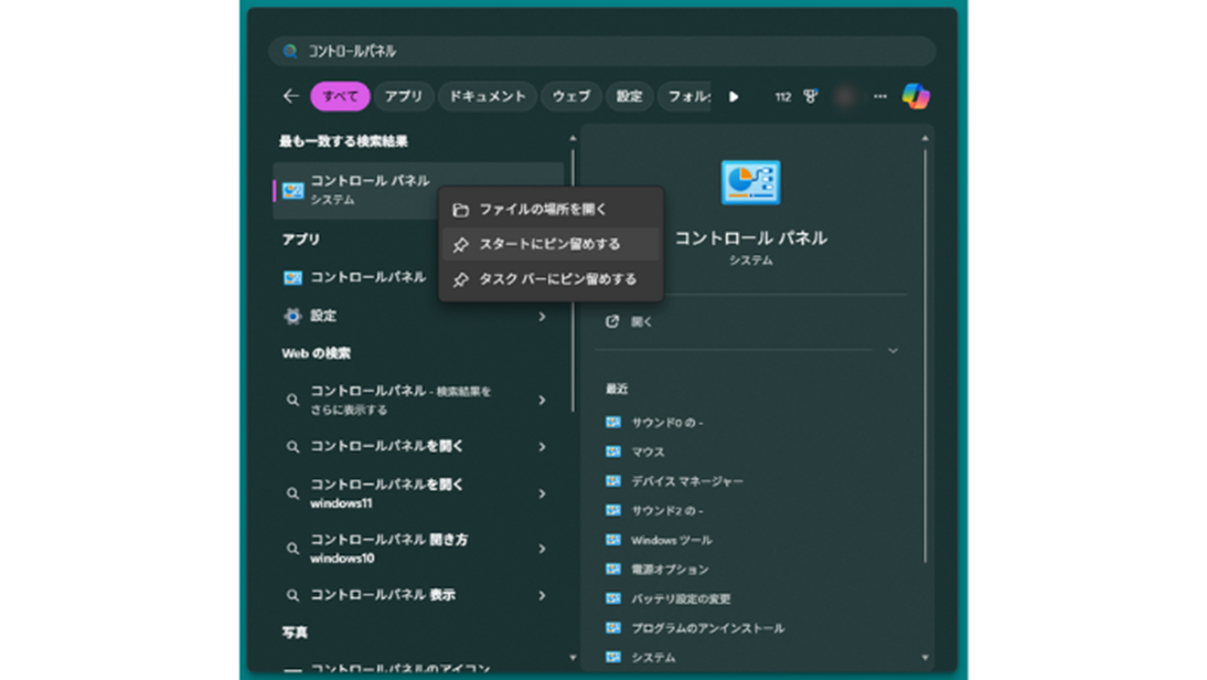 検索結果に表示された「コントロールパネル」を右クリックして、「スタートにピン留めする」を選択します。