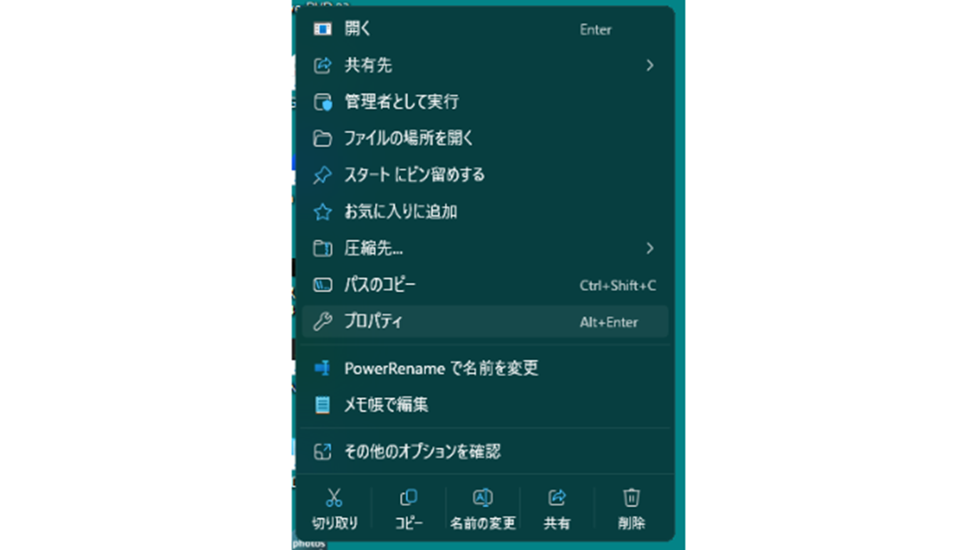 ショートカットを右クリックして「プロパティ」を選択します。