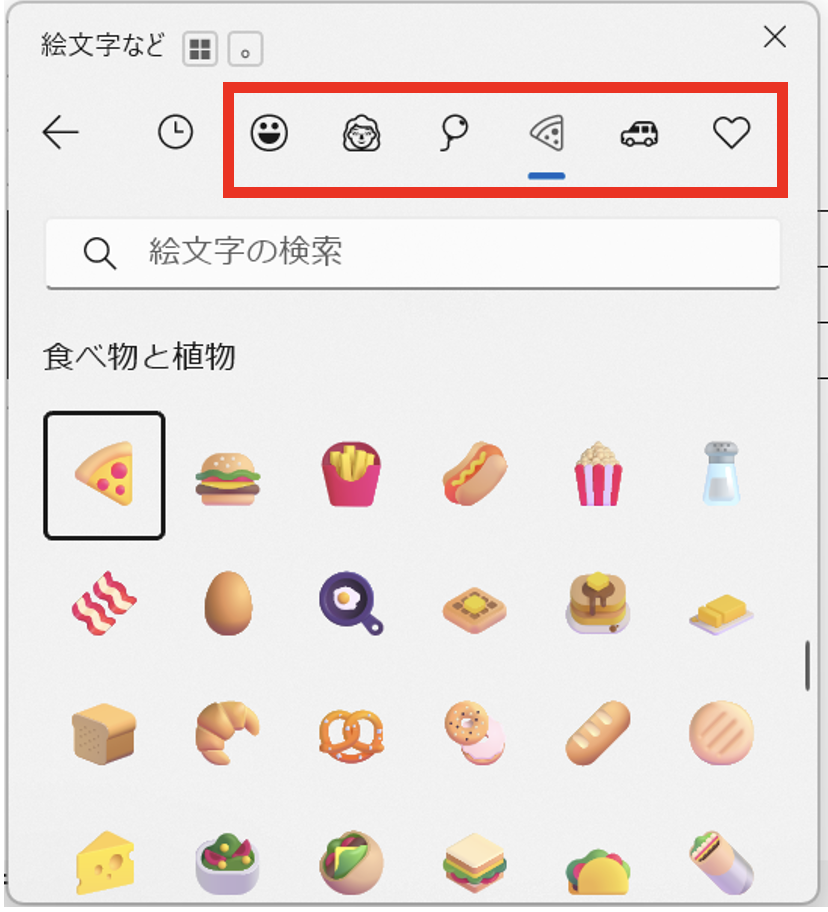 カテゴリアイコンをクリックするとカテゴリ別に絵文字を選べます。顔・動物・食べ物・乗り物・記号などのカテゴリがあります。