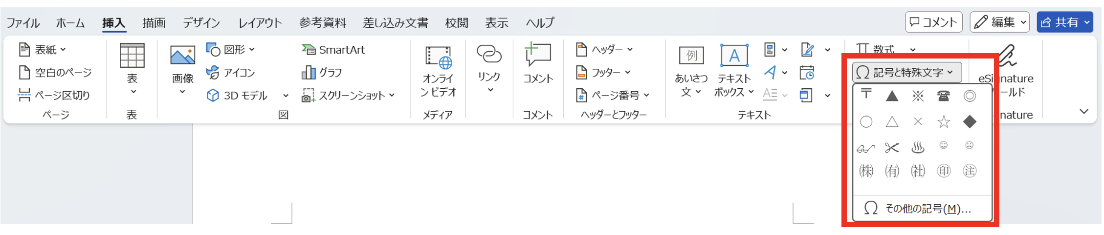 ワード独自の「記号と特殊文字」機能を使うことで、絵文字に近いデザインの記号や特殊文字を挿入することもできます。