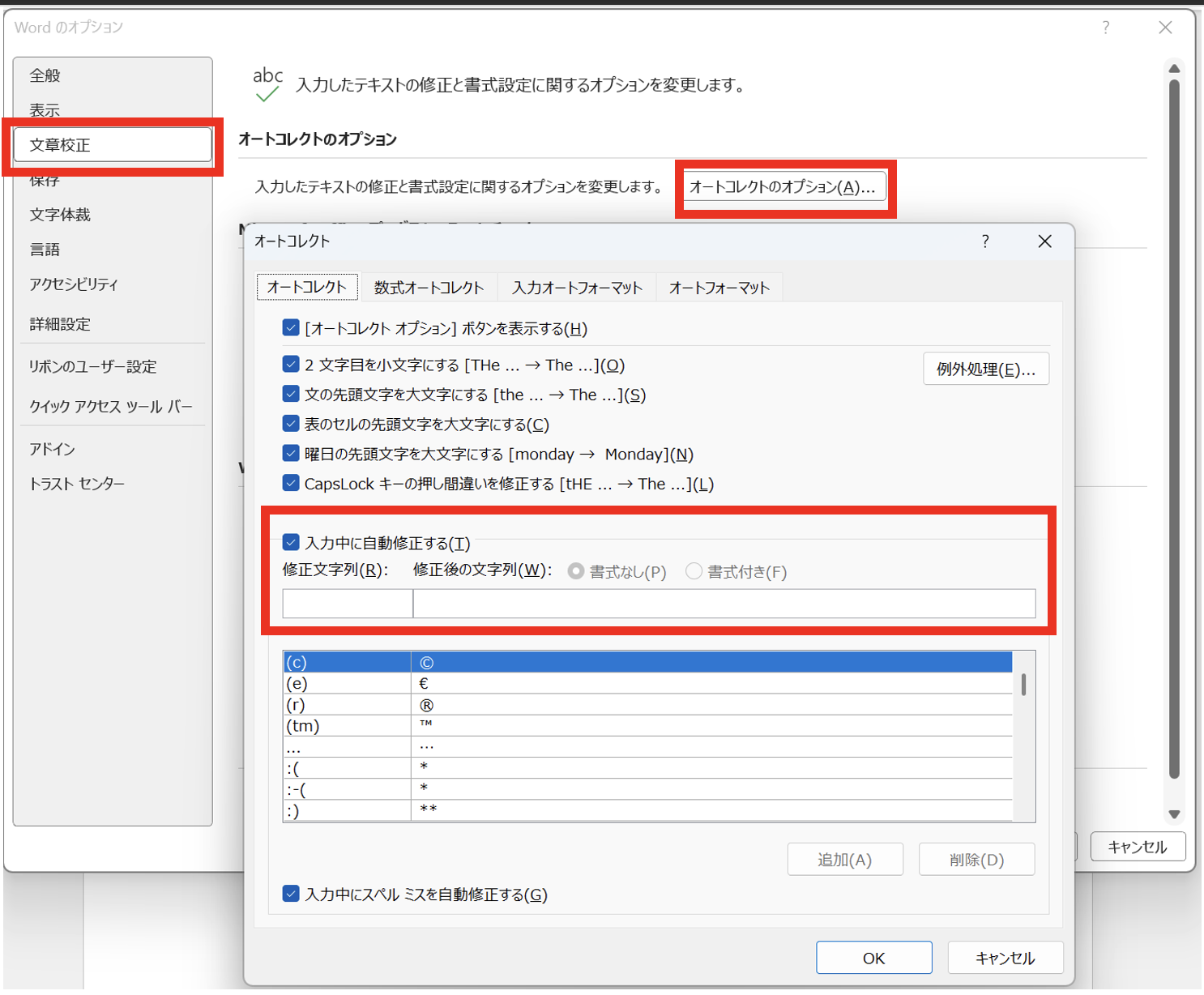 「ファイル」→「オプション」→「文章校正」→「オートコレクトのオプション」を開きます。