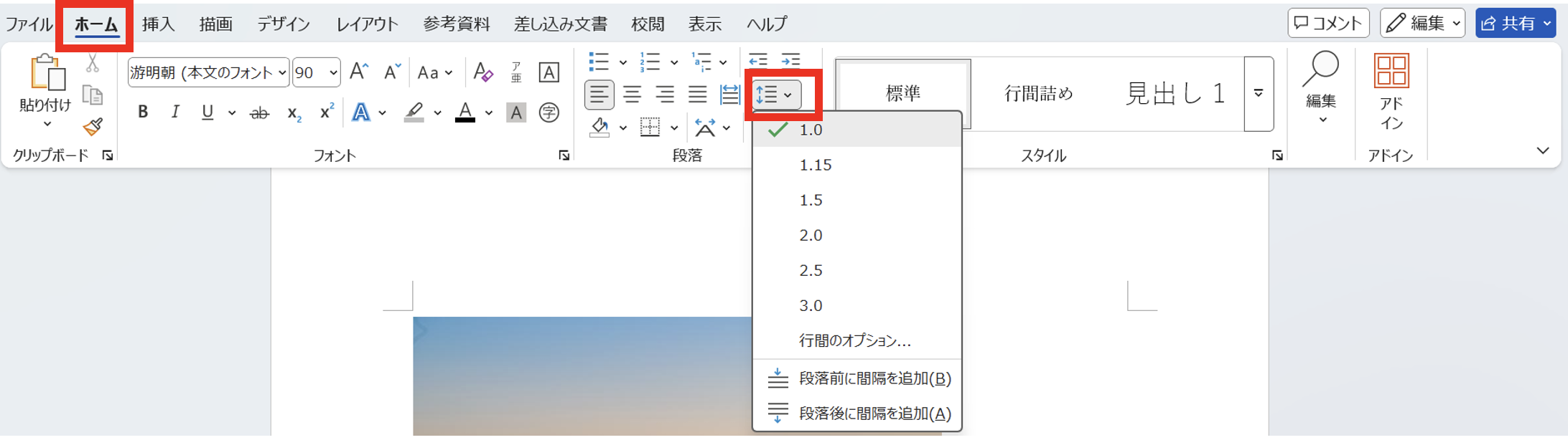 絵文字を含む行の高さ調整は「段落」の行間設定から行います。