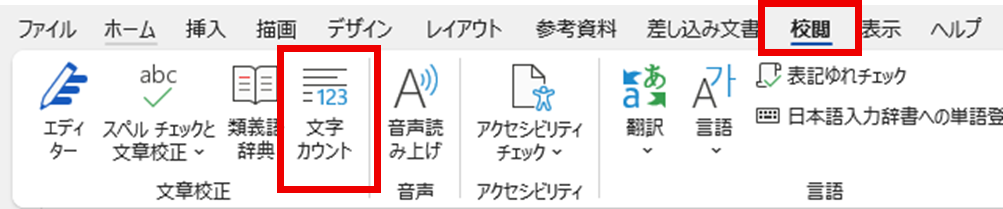 タブの「校閲」から文字数を表示させる方法を解説します。