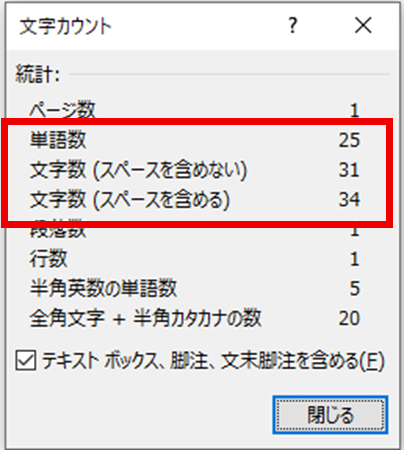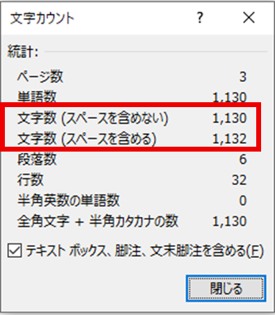 スペースを含めてカウントする場合は、「文字数(スペースを含める)」の文字数を参照します。