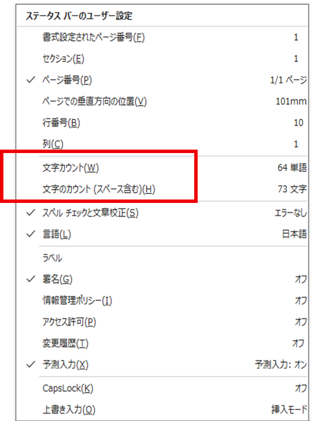 「文字カウント」「文字カウント(スペース含む)」にチェックが入っていないのがわかるでしょうか。