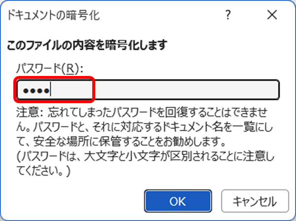 「ドキュメントの暗号化」ダイアログが開くと、パスワードが「●●●●」のように表示された状態になっています。