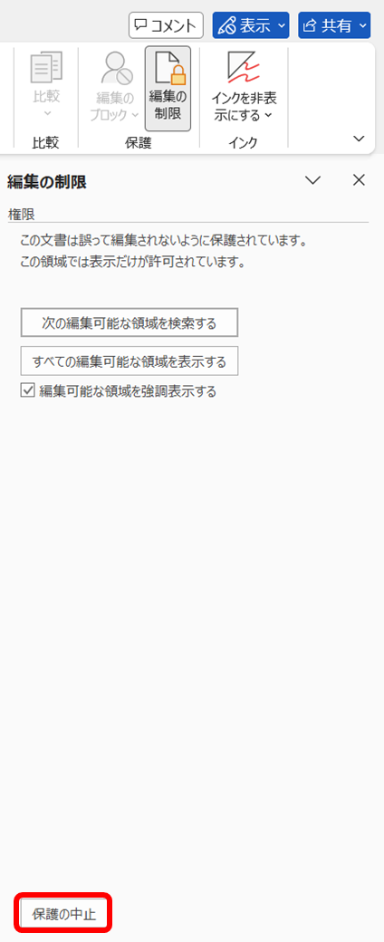 画面右側に「編集の制限」パネルが表示されるので、下部にある「保護を停止」ボタンをクリックします。