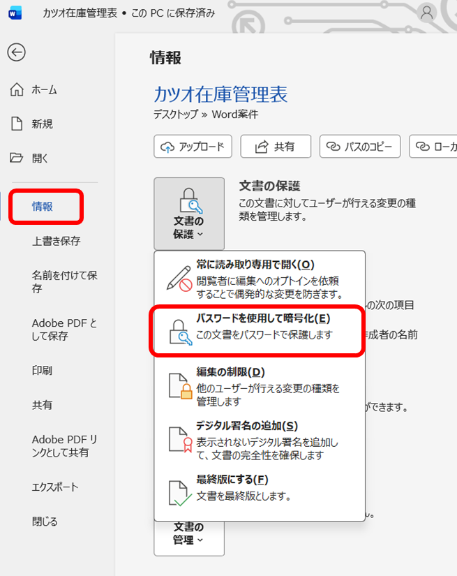 | カツオ在庫管理表.docx | 読み取りパスワード | 開く際にパスワード入力が必要 |
