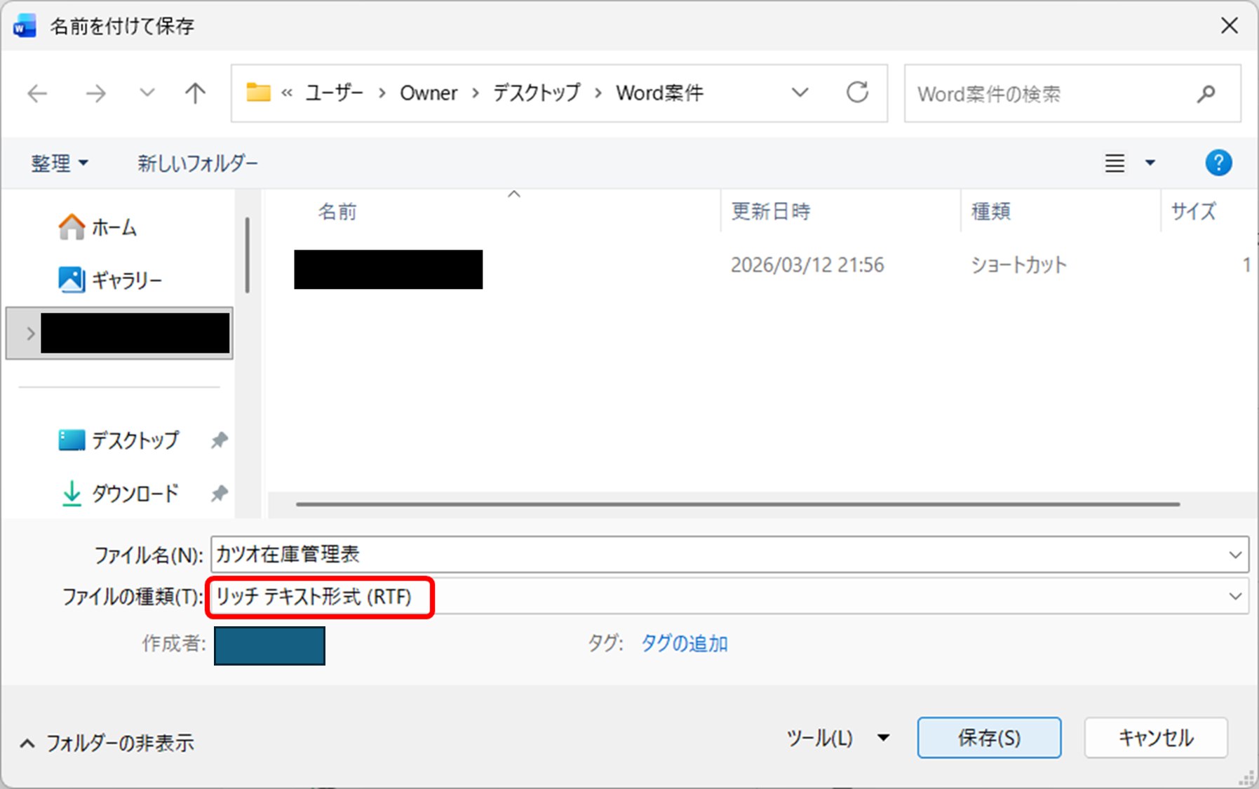 まず、編集制限がかかった状態でファイルを開き「ファイル」タブ→「名前を付けて保存」から、ファイル形式を「リッチテキスト形式(.rtf)」に変更して保存します。