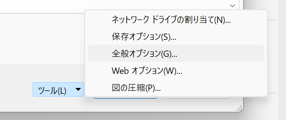 保存ダイアログが表示されたら「参照」 → 「ツール」→ 「全般オプション」をクリックします。