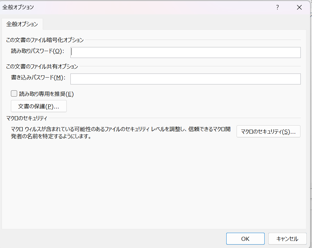また、「名前を付けて保存」→「ツール」→「全般オプション」でも設定状況を確認できます。