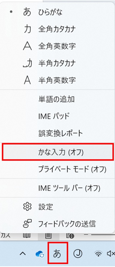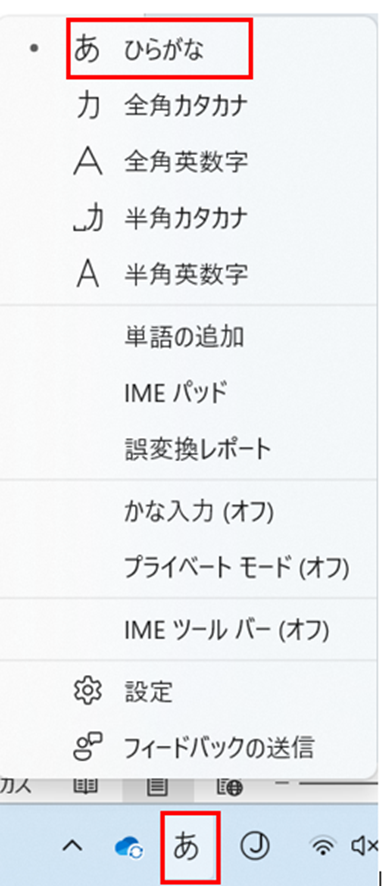 ・「かな入力」に設定されている場合:タスクバーの「A」を右クリック→メニューから「ひらがな」を選択